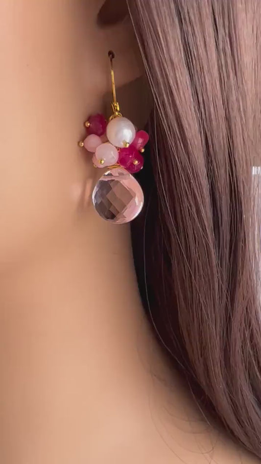 Rosa Opal, Süßwasserperle, leuchtend rosa Chalcedon-Cluster, baumelnde goldene Ohrringe in Herzform aus rosa Quarz.