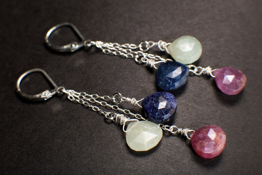 Natürlicher Multi-Saphir-Ohrring mit drahtumwickeltem Briolette-Edelstein in Tropfenform, 925er Sterlingsilber, Kette und Ohrbügel, auch in 14 Karat Gold gefüllt