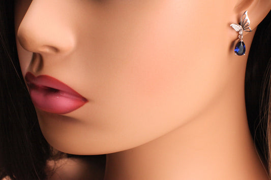 Echter saphirblauer Tropfen 6x9mm CZ Diamantfassung baumelt an Schmetterling, 925 Sterling Silber Ohrstecker, 925 gestempelt, Geschenk für Sie