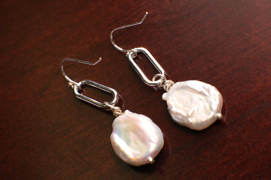 Natürliche Süßwasser-Münzperle, 18 mm, große Größe, baumelnde Büroklammer-Gliederohrringe aus 925er Sterlingsilber
