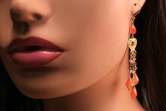 Echte Karneol-Briolette, baumelnde, facettierte 7 x 10 – 11 mm, Tropfenform mit rosa Topas-Abstandshaltern, Kronleuchter-Herz, Gold-Vermeil-Ohrringe
