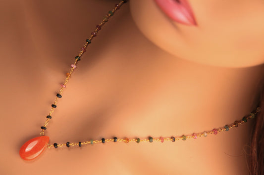 Drahtumwickelte Kette mit natürlichem Multi-Turmalin und langem Tropfenanhänger aus orangefarbenem Karneol, handgefertigte Halskette aus 18 Karat Gold Vermeil