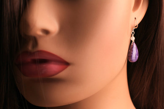 Natürlicher Charolit glatter Tropfen, Mondstein-Oberteil-Abstandshalter, 925 Sterlingsilber-Ohrhänger. Wunderschöner seltener Edelstein-Ohrring in AAA-Qualität