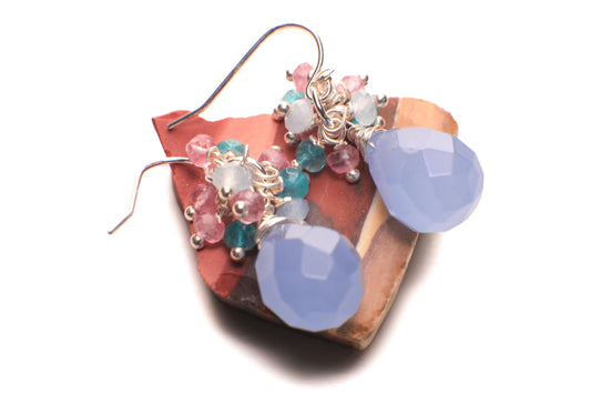 Natürlicher Himmelschalcedon 12x16mm Tropfen Briolette baumelnd, Apatit, rosa Topas, Aquamarin Cluster 925 Sterling Silber Ohrringe