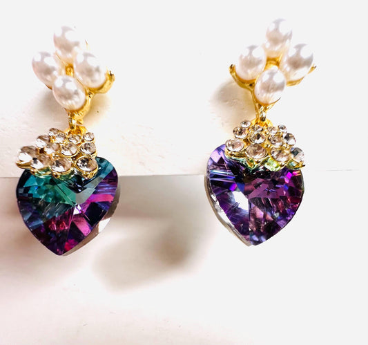 Swarovski Kristall Lila AB Regenbogen Aurora Broiles 14mm Herz mit Perle Gold Post Ohrringe, Valentinstag Freundin Geschenk, rosa lila mystisch