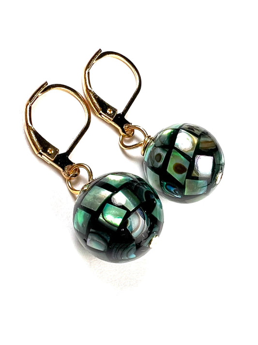Natürliche Abalone Pua Muschel Mosaik Disco Kugel 12,5mm Runde Ohrringe 925 Sterling Silber Gold,Blau Grün Regenbogen handgemachtes Geschenk für Sie