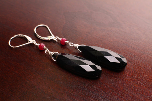 Schwarzer Onyx Facettiert Langer Birnentropfen 10x30mm Langer Tropfen 4mm Echter Rubin Akzent 925 Sterling Silber Leverback Ohrring Anhänger Set elegantes Geschenk
