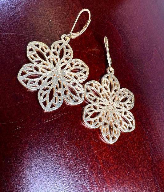 18 Karat Gold Vermeil Bali Brush Gold Filigrane Blume 28 x 35 mm Handgemachte Leverback Ohrringe, wunderschöne hellgelbe Goldfarbene Ohrringe, Geschenk