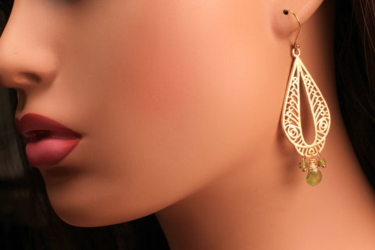 Handgemachter Ohrring aus gebürstetem Gold Vermeil mit natürlichem Peridot, drahtumwickelt, Geburtsstein für August