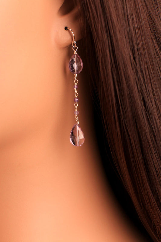 Echter rosa Amethyst, konkav geschliffen, facettierte Träne, geschliffener Edelstein, drahtumwickelte Amethystkette in 925er Sterlingsilber-Ohrringen