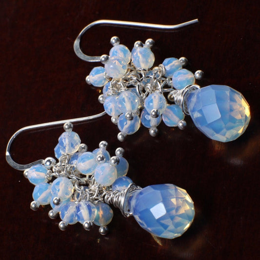Opalit Facettierte Briolette 10x14mm Tropfenform Draht umwickelt Hänger mit Opalit Clustern in 925 Sterling Silber Silber Ohrhaken