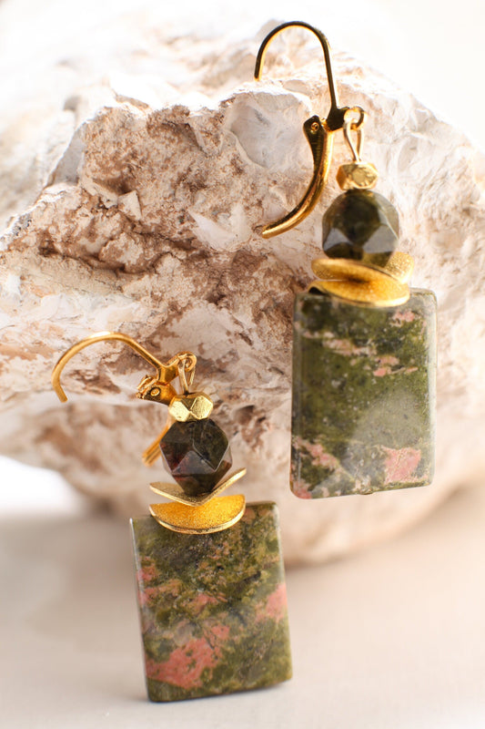 Echte Unakit-Edelsteinohrringe, 15 x 20 mm, rechteckig, mit goldgebürsteter Abstandsscheibe, 6 mm Unakit-Oktagon-Gold-Bügelohrringe