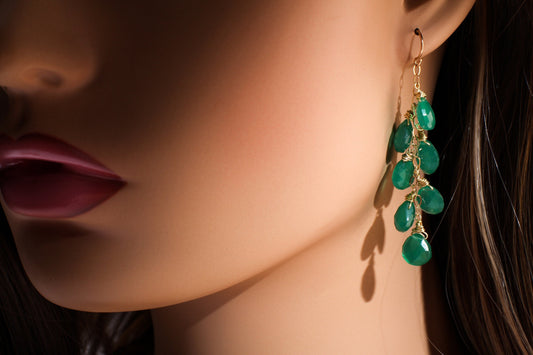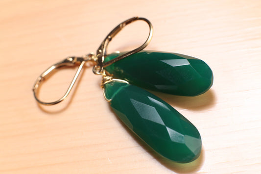 Echter grüner Onyx 9,5x25mm Drahtumwickelter Briolette-Tropfen in 14K Gold Filled Lever Back Ohrring, Kostbares Geschenk für Sie