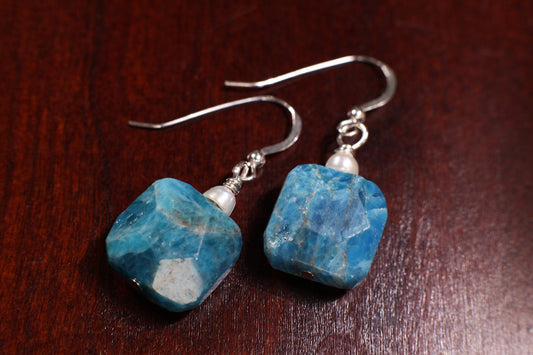 Natürlicher Apatit Facettierte Kissenform 16mm Ohrring mit Süßwasserperlen Spacer Kappe in 925 Sterling Silber Ohrhaken, Minimalistisch, Handgemachtes Geschenk