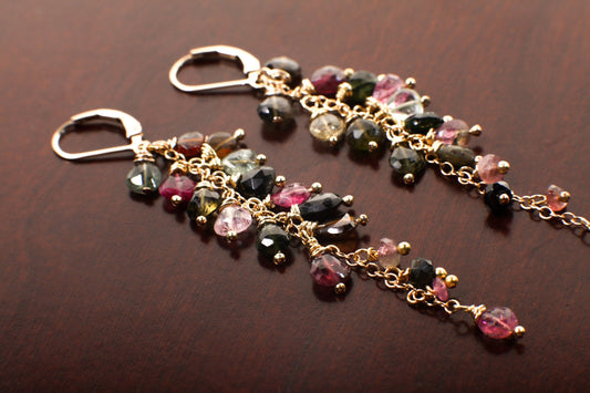 Wassermelonen-Turmalin-Kaskaden-Ohrringe, drahtumwickelte baumelnde Herz-Briolette in 14K Gold gefüllt oder 925 Sterling Silber Braut, Boho, handgefertigt
