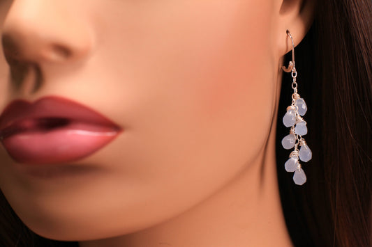 Blauer Chalcedon, facettierte Briolette, handgefertigt, Sterling-Silber, drahtumwickelt, baumelnde Tropfen-Kaskaden-Ohrringe aus 925er Sterling-Silber