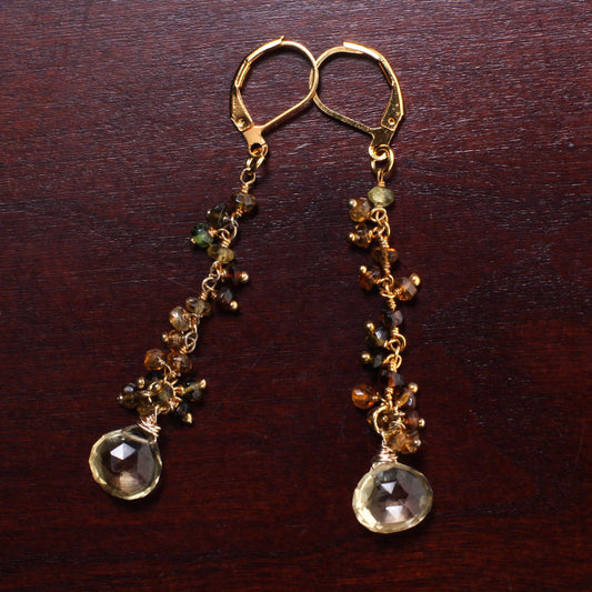 Natürlicher Zitronenquarz-Tropfen mit petrobraunem Turmalindraht umwickelt, 22 Karat Gold Vermeil-Ohrringe, natürlicher Edelstein, handgefertigtes Geschenk