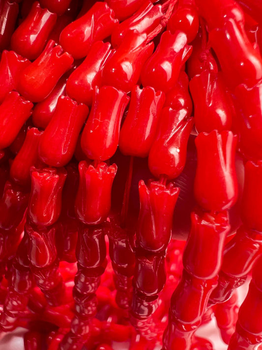 Natural Italian cora Tulip Flower Handcarved 4x8 mm AAA quality Handcrafted bright Red coral Beads 8”(26 pcs) or 15.5”(52pcs) strand