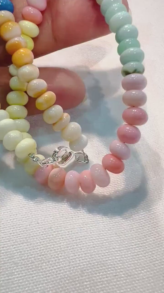 Multi-Opal Peruanischer Rosa Blau Gelb Pastell Opal, Candy Opal glatte Roundel Halskette für Männer und Frauen. Strand Boho Sommer Geschenk