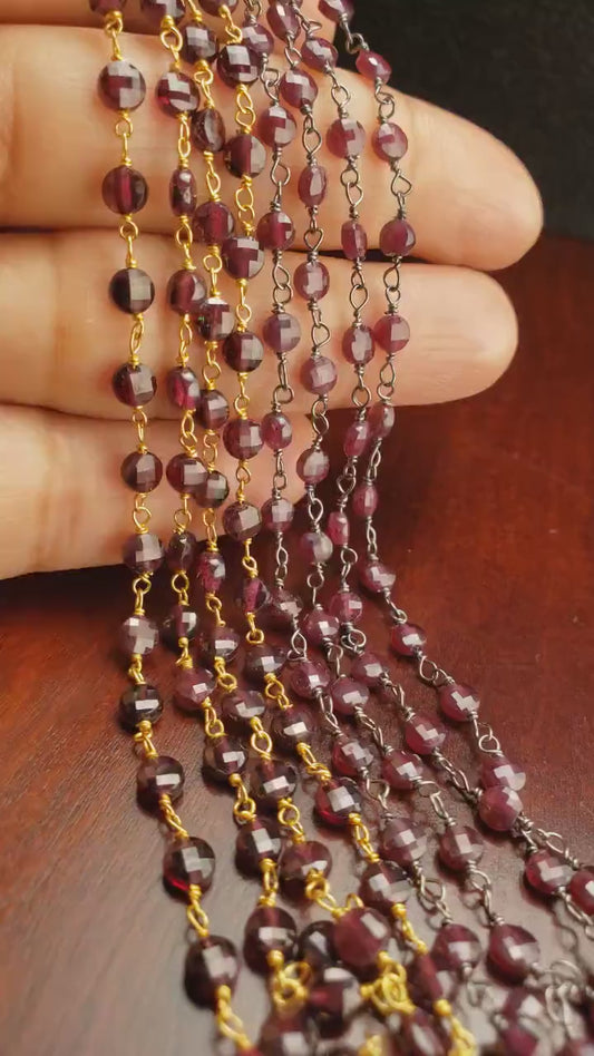 Granat-Münzform, drahtumwickelt, 4 mm, facettiert, 10-Cent-Stück, Gold und oxidiertes Silber, handgefertigt, elegante Halskette als Geschenk. Geburtsstein für Januar
