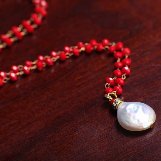 Süßwasser-Münzperlen-Charm-Anhänger mit zierlichem rubinrotem Kristall, 3 mm Rondell, Draht umwickelt, Rosenkranzkette, Goldkette