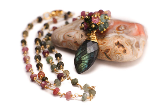Labradorit Grün Blau Blitz mit Wassermelonen Turmalin Cluster Anhänger mit Multi Turmalin Kette Gold Halskette Boho, Strandmode Geschenk