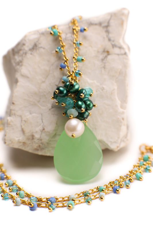 Grüner Chalcedon-Tropfen, 16 x 25 mm, drahtumwickelte 7 mm Süßwasserperle, Apatit, Amazonit, grüne Perlencluster mit goldener Rosenkranzkette