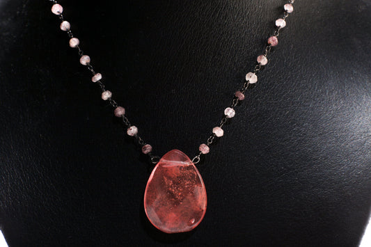 Erdbeerquarz Facettierter Tropfen-Anhänger in einer mit Erdbeerquarzdraht umwickelten Rosenkranzkette