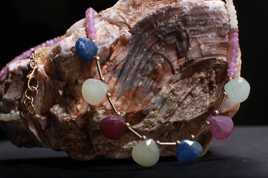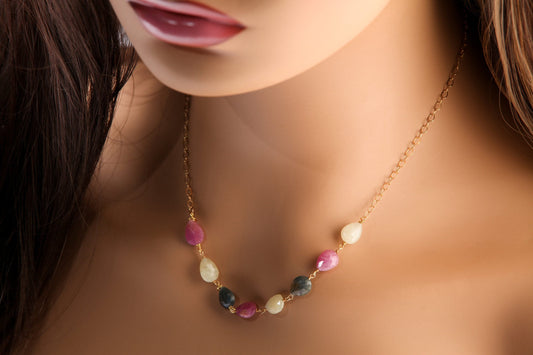 Natürliches Multi-Saphir-Herz-Tropfenstück mit 4 mm Multi-Saphir-Rundstück, 14 K Flüssiggold gefülltes Röhrchen, Abstandshalter und Verschluss, 16"-30" Halskette