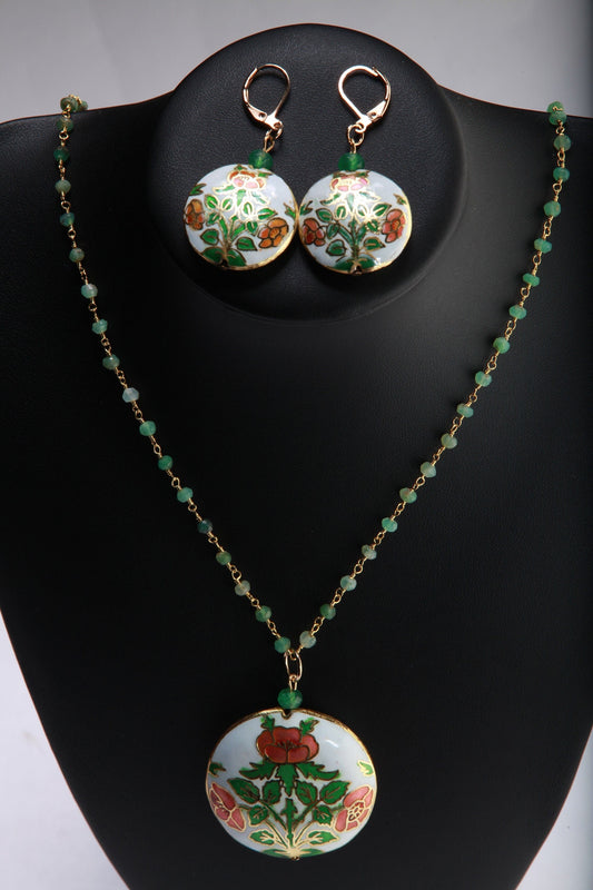 Traditioneller Cloisonné-Anhänger im Vintage-Stil, Blumenmuster, rosa, mit natürlicher Chrysopras-Perlenkette, 50,8 cm, und passendem Ohrring-Set