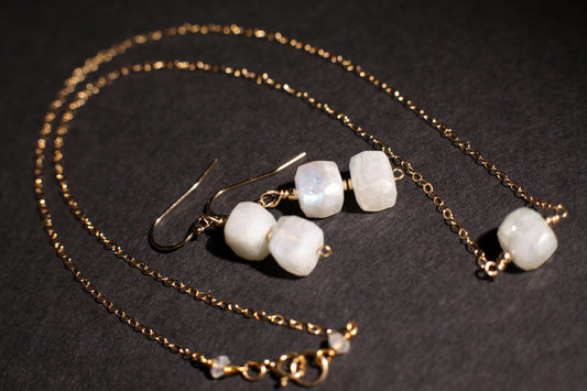 Mondstein Facettierter Würfel, 14 Karat Gold gefüllte Halskette und Ohrringe Schmuckset. Drahtumwickelter baumelnder handgemachter eleganter Mondsteinschmuck Geschenk