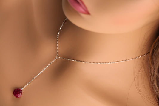 Halskette aus echtem Rubin, facettiert, 11 mm, Herz-Briolette, Tropfenform, drahtumwickelte Halskette aus 925er Sterlingsilber, Valentinstagsgeschenk