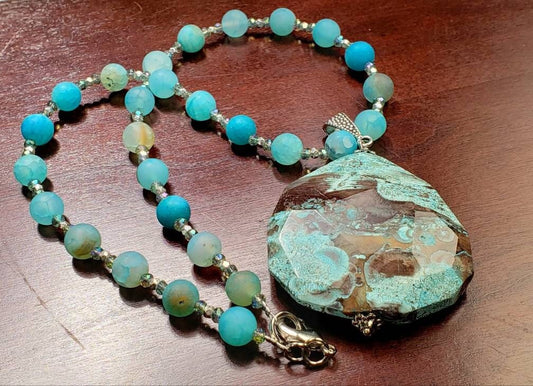 Großer Anhänger aus Ozeanjaspis mit mattem Feuerachat, natürlicher Edelstein, handgefertigte Halskette, 17,5"