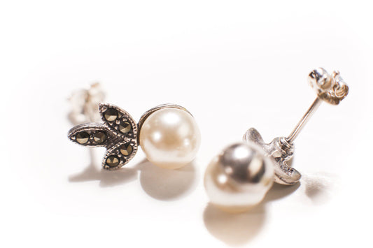 925 Sterling Silver Marcasite with Pearl 8mm Flower Post Earrings and Sterling Silver Box Chain 16" Necklace vintage Antique jewelry set.
