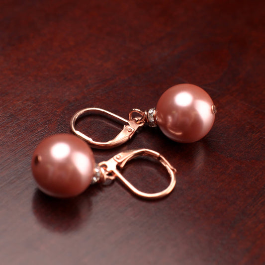 Copper Pink South Sea Shell Pearl 12mm High Luster Earrings, CZ Rhinestone Spacer, Rose Gold Leverback, Bridal, Gift for Her