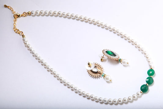 Green Onyx Faceted Coin, Natural Oyster Shell Pearl 8mm Adjustable Necklace, Emerald Crystal CZ Dangling Earrings Bridal Jewelry Set