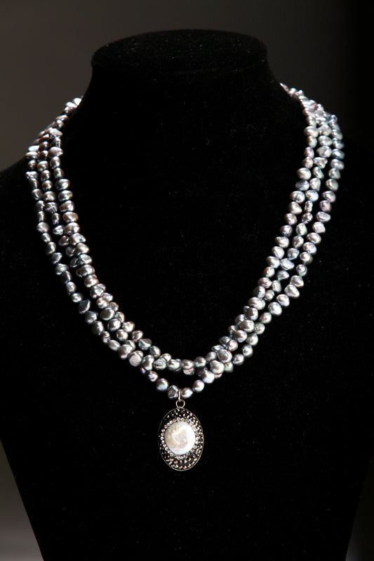 Natural Freshwater Gray Pearl High Luster Triple Strand Necklace, Freshwater 12mm Coin Pearl & Rhinestone Inlaid Pendant, 17"+2" Extender