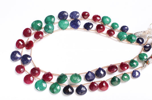 Ruby Sapphire Emerald Heart Briolette Drop,Genuine Graduated Ruby , Sapphire,Emerald Green Faceted Teardrop 8-11mm Gemstone, 12, 24 pcs mix
