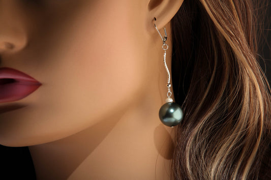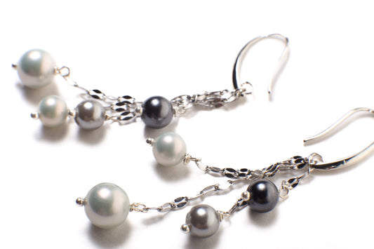 South Seashell Pearl Grey, Silver, Black, Tri color Dangling Rhodium Earrings, Bridal, Boho, Handmade Elegant Gift for Her