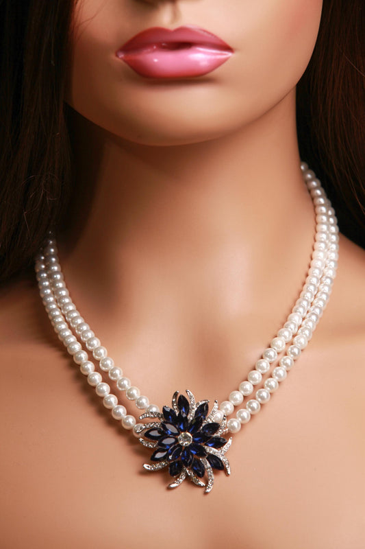 South Sea Shell Pearl 8mm Double Layered Necklace with Blue Sapphire 40mm CZ Pendant Necklace 18”& 2" Extension Chain wedding party jewelry