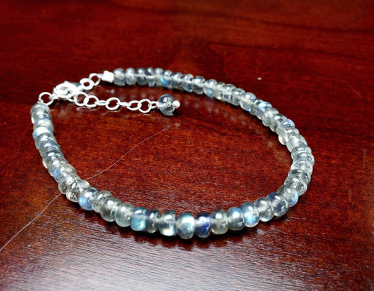Labradorite Smooth Roundel 4.5mm Blue Flashy 925 Sterling Silver Bracelet with 1" Extender, Gift for Woman, Chakra, Yoga Energy Healing gift