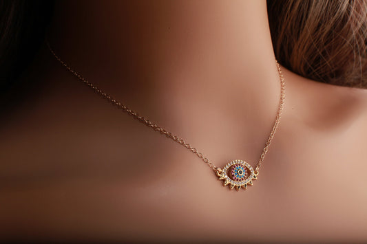 Evil Eye CZ Pendant 14K Gold Filled Chain Necklace, Evil Eye Protection Charm Necklace, Cubic Zirconia Jewelry Gold Lucky Charm Necklace