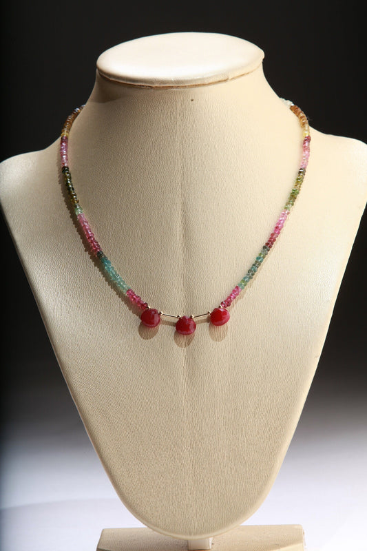 Ruby Tourmaline Necklace, Faceted Ruby Heart Teardrop, Stunning Tourmaline in Liquid 14K Gold Filled Tube Spacer Beads Clasp Lucky Necklace