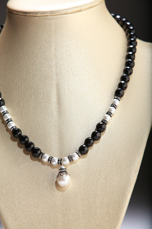 Black Onyx Faceted Round,white South Sea Shell Pearl and Rhinestone Roundel Accent with south sea shell pearl pendant Necklace. Elegant gift