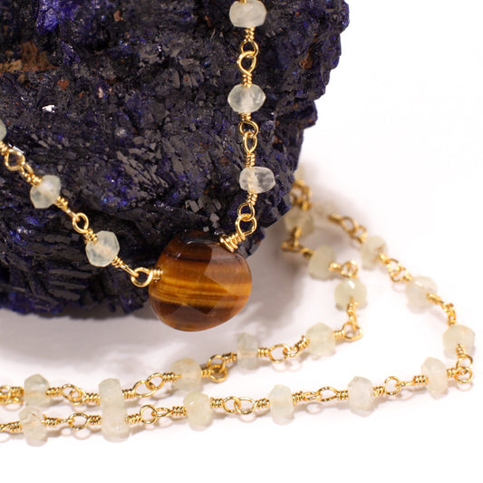 Natural Moss Aquamarine Wire Wrapped Rosary Necklace with Natural Tiger Eye 10mm Heart Pendant Gold Necklace