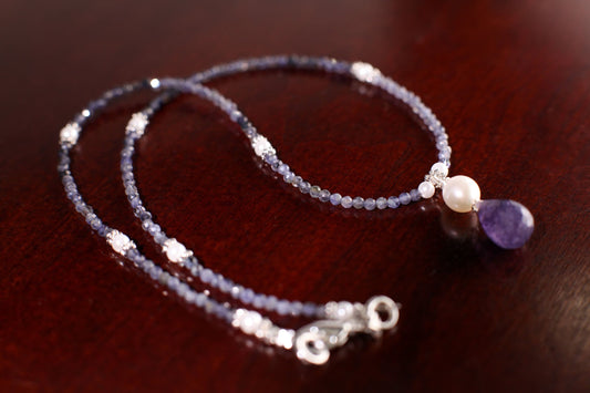 Natural Ombre Iolite Shaded 2.5mm Diamond Cut Round, Freshwater Pearl Spacers and iolite Pendant Necklace