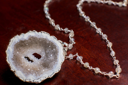 Natural Druzy Agate, Geod Free Form Silver Bezel with Labradorite Beaded Chain 14"-30"Necklace, Natural Healing,very Sparkling Druzy gift.