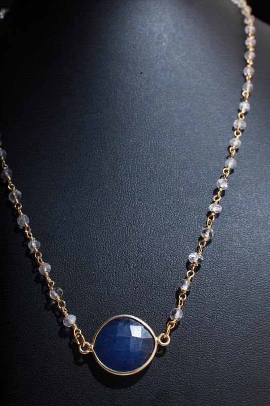 Sapphire Faceted Gold Bezel Pendant Necklace with Moonstone Beaded Rosary Chain 16"to 24" Necklace, September Birthstone, Girlfriend Gift