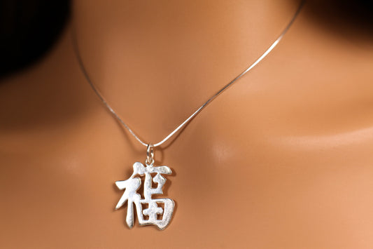 925 Sterling Silver Chinese Character Fú , Good Luck, Fortune, Blessing and Happiness Symbol with Italian 925 Sterling Silver Snake Chain