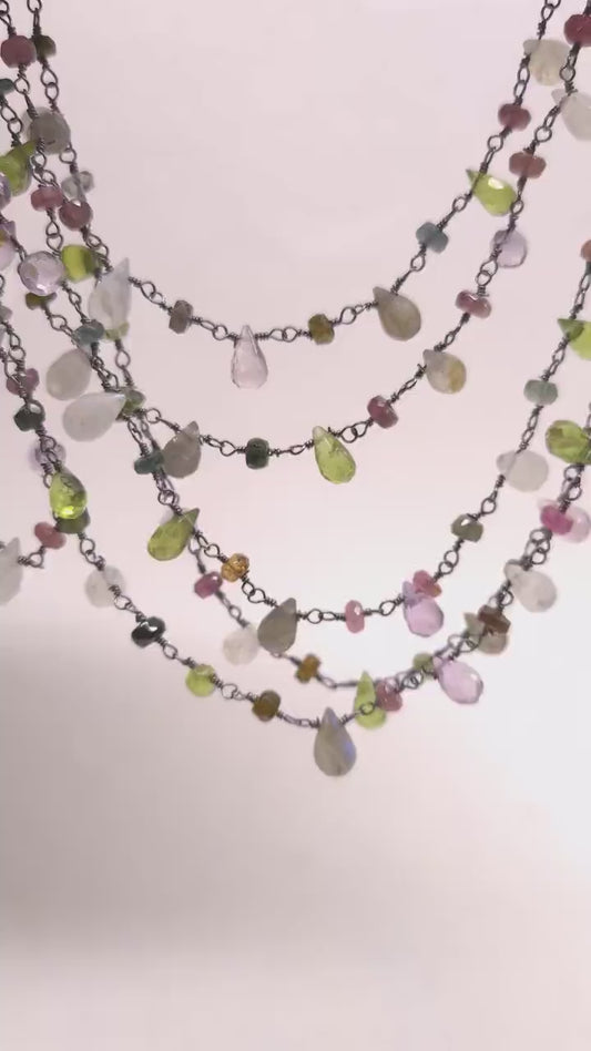 Multi Gemstone Faceted Briolette Rondelle Wire Wrapped Oxidized Silver Necklace, Peridot, Labradorite, Moonstone, Tourmaline, Pink Amethyst